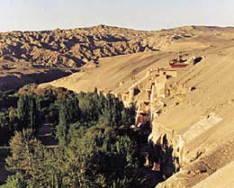 Located on the eastern slope of Rattling Sand Mountain (Mingshashan) southeast of Dunhuang County in Gansu Province, the Mogao Grottoes (also known as Thousand Buddha Cave) is one of three noted grottoes in China and also the largest, best preserved and richest treasure house of Buddhist art in the world.