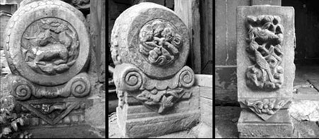 The gate pier might not be very important to the architectural art of traditional Beijing courtyard houses, but it does have its own distinctive features. In fact, the gate pier is not only for "little kids" to ride on and play with, but also to be used to join and support the doorframe, the doorsill and the door leaf of the main door or the middle door of the residences. The rear part of the stone gate pier is drilled with an axial trough, which is used to hold the door leaf; the front part opposite to the doorsill is mostly polished into square or round shape and carved with lines or patterns of birds, beasts, flowers, grass, as well as musical instruments, chess, Chinese calligraphy and paintings. These lines and patterns make use of puns to express best wishes for an auspicious and wealthy life. For example, "xishang meishao" (a magpie on a plum tree branch) symbolizes joy and happiness; "pingsheng sanji" (three short halberds in a bottle) symbolizes a promotion to three levels up; "wushi tongju", (five lions in one house) symbolizes the flourishing population in one family since five generations all live under one roof; and "qilin wosong" (a kylin standing on a pine tree) symbolizes the long-lasting luck.
