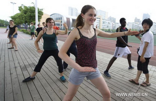 German students learn to play Taiji in Hefei, capital of east China's Anhui province, Aug 7, 2010. Fifty four German students from seven Confucius Institutes started their week-long summer camp from Aug 5 to taste Chinese culture in Anhui province.